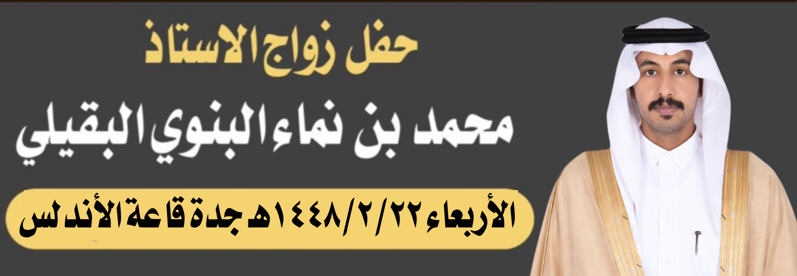 | حفل زواج الأستاذ محمد بن نماء البنوي البقيلي | الأربعاء | 1448/02/22هـ | جدة قاعة الأندلس للإحتفالات |